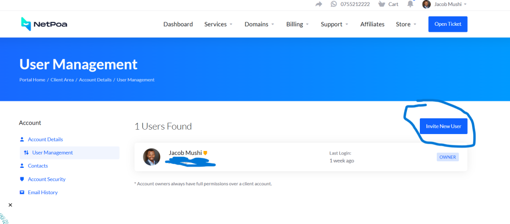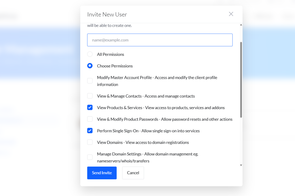 Netpoa allows you to securely share access to your hosting account without giving out your password, by inviting another user with limited permissions.